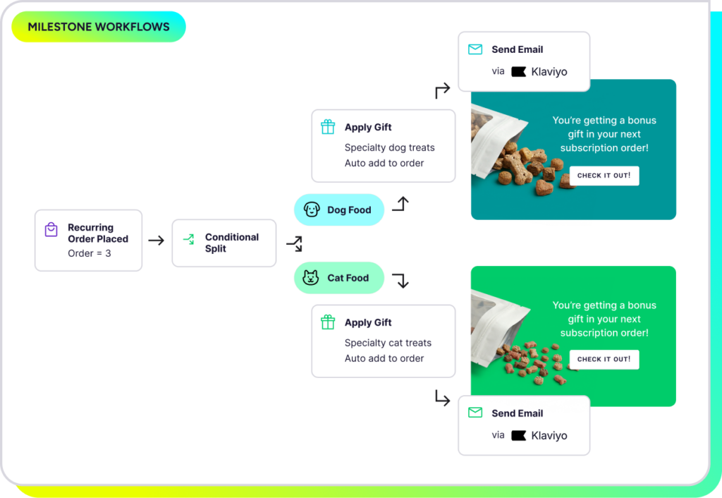 Milestone Workflows (early access) make it easier to recognize and reinforce the moments that matter most to subscriber loyalty. Brands can use an intuitive drag-and-drop builder to automatically trigger a gift or discount when a subscriber hits a specific recurring order number. That makes it easier to get ahead of churn with a well-timed reward before a subscriber decides to leave.