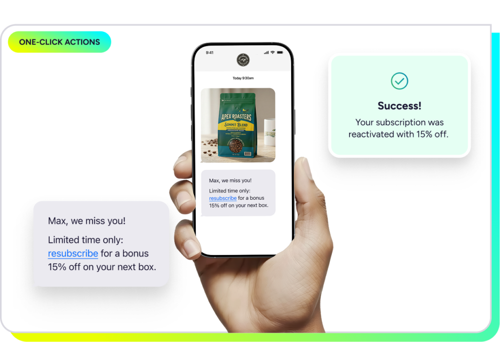 Even when a subscriber does leave, the relationship does not have to end there. Win back subscribers effortlessly with new one-click actions (early access) that make the path to resubscribing simple. Subscribers can reactivate with a single click in an email or SMS, where a welcome-back discount is already attached. Instead of forcing returning intent through a multi-step account flow, brands can turn that moment into immediate action.
