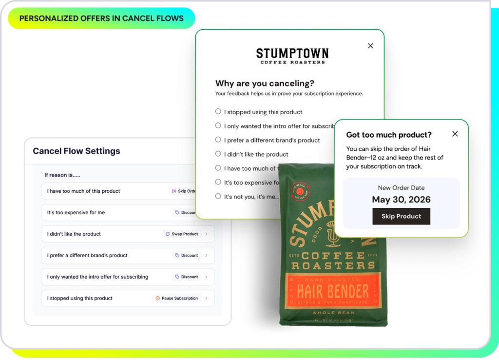 Now, Personalized Offers in Cancel Flows (early access) make that intervention more precise. Rather than showing every at-risk subscriber the same save tactic, brands can tailor the response to why the subscriber is leaving. Too much product on hand? Offer a skip. Price sensitivity? Surface a retention discount.