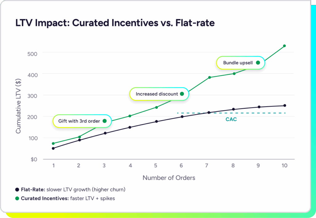 Curated incentives, by contrast, continue working after the initial conversion to build compounding value over time. In a study of 100 top subscription brands, Ordergroove found that curated incentives drove 40% more repeat orders across the first nine subscription cycles than flat-rate discounts, and by the ninth order, retention was more than twice as high.