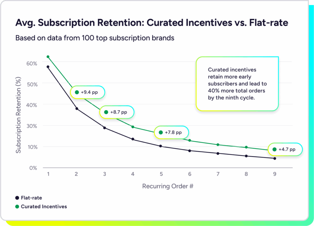 Curated incentives, by contrast, continue working after the initial conversion to build compounding value over time. In a study of 100 top subscription brands, Ordergroove found that curated incentives drove 40% more repeat orders across the first nine subscription cycles than flat-rate discounts, and by the ninth order, retention was more than twice as high.
