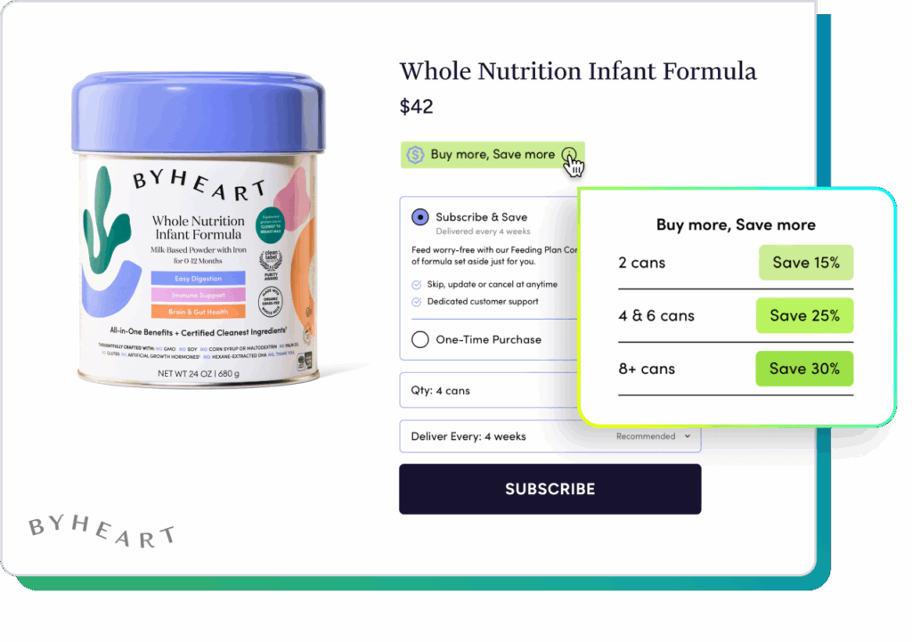 In the run-up to the holidays, infant nutrition brand ByHeart introduced a Subscribe More, Save More curated incentive that rewarded families for adding extra products to their recurring orders. The promotion went live during BFCM and extended into January, driving a surge in subscriber engagement when shoppers were most eager for deals.