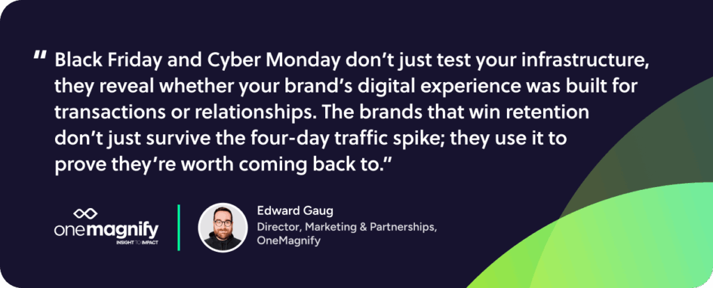 “Black Friday and Cyber Monday don’t just test your infrastructure, they reveal whether your brand’s digital experience was built for transactions or relationships. The brands that win retention don’t just survive the four-day traffic spike; they use it to prove they’re worth coming back to.”