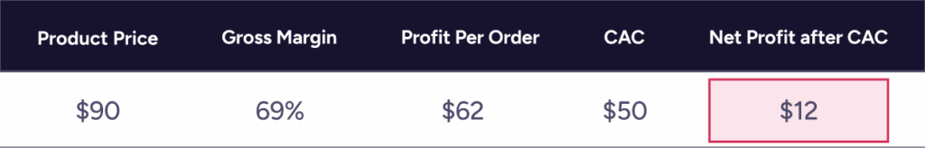 Now, assume that during BFCM, this brand spends $50 to acquire each new customer, which leaves just $12 in net profit per order after CAC.