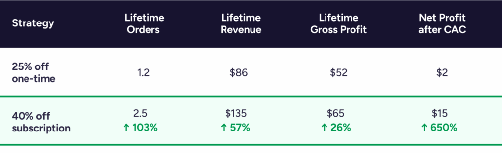 With those numbers in mind, let’s compare two different discount strategies: a smaller 25% discount for one-time buyers versus a larger 40% discount for subscription purchases.