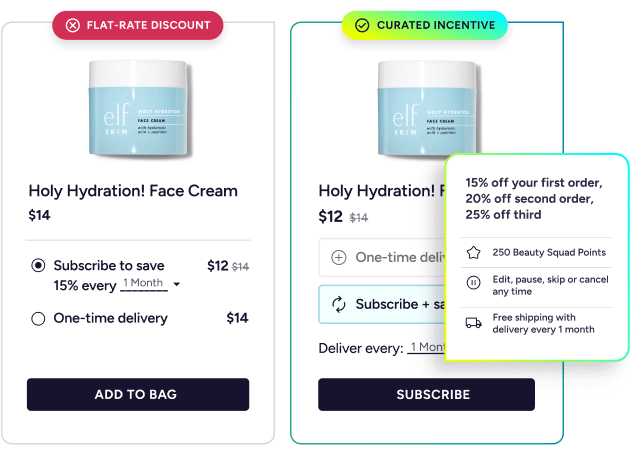 e.l.f. Cosmetics leaned on curated incentives to transform short-term subscribers into long-term value. They introduced a subscription offer where the discount increased with each recurring order, starting at 15% for the first order, rising to 20% for the second, and 25% for the third. This tiered incentive structure gave customers a reason to keep their plan active and add more items to their cart each order cycle, driving 62% YoY recurring revenue growth